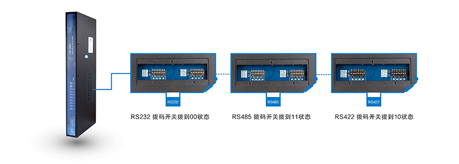 默认工作在RS485模式下,RS485/422串口要调节相应的拨码位置。
