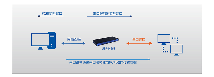 串口服务器同时监听端口,将所有接收的数据转发给串口设备。
