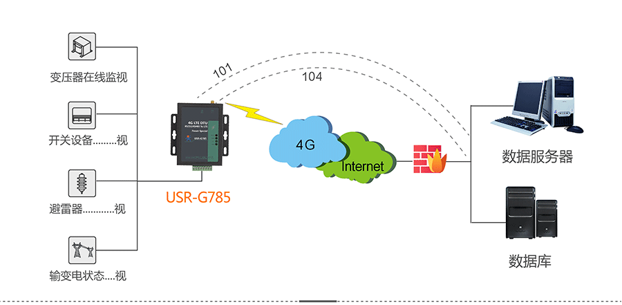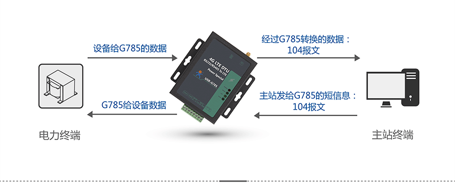 按照电力104协议传输数据,DTU作为子站端的一部分,只需将数据通过串口发给DTU,USR-G785就会将104报文发送给服务器。