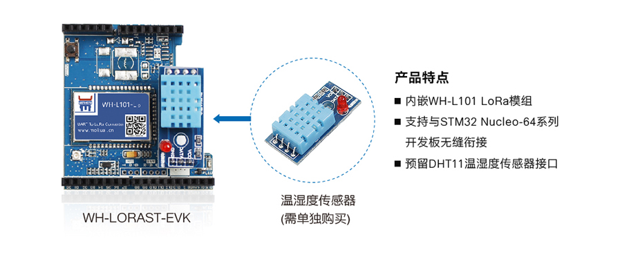 WH-LoRaST-EVK扩展板为STM32 Nucleo-64开发板的配件,板载WH-L101 LoRa模组和DHT11温湿度传感器,支持与STM32 Nucleo-64系列开发板无缝衔接,可帮助用户快速构建与LoRa相关的应用。同时,用户也能通过运行配套的Demo例程,实现使用STM32采集温湿度数据并上报到有人透传云的功能。用户借助透传云,可0编程实现多种形式的数据展示。