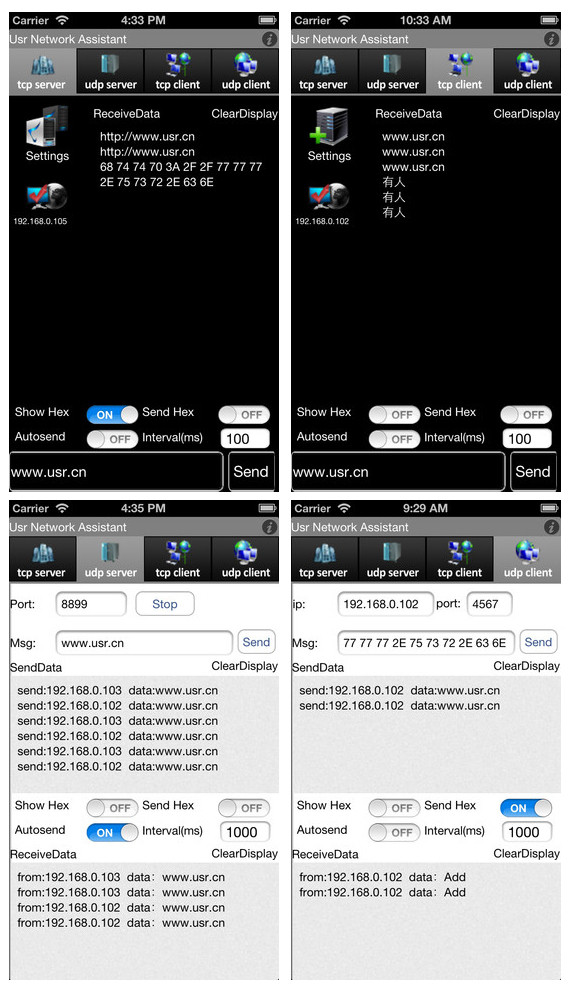 USR-SocketTools适用于任何一款网络设备,支持TCP Client、TCP Server、UDP,通过苹果手机即可实现向指定IP、端口发送数据,方便调试。