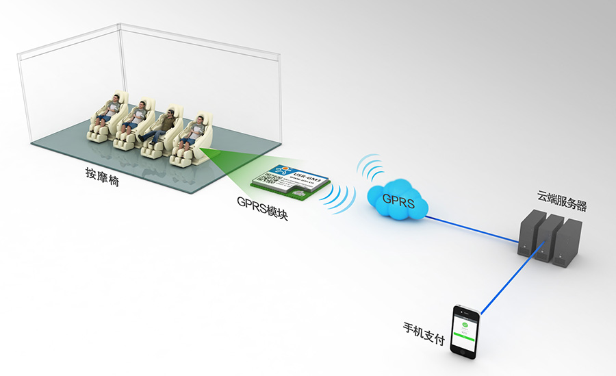 商用按摩椅采用2/3/4G DTU与云端服务器进行连接,顾客通过手机的移动支付,微信或者支付宝对椅子把手上的二维码进行扫码支付,手机将支付信息上传到远端服务器,云端服务器通过2/3/4G DTU控制按摩椅按照支付的相关费用开机运行。