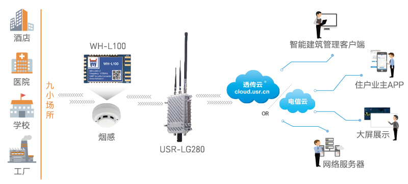 1、将LoRa无线传输模块WH-L100-L嵌入独立式烟感,搭配LoRa集中器USR-LG280组网工作