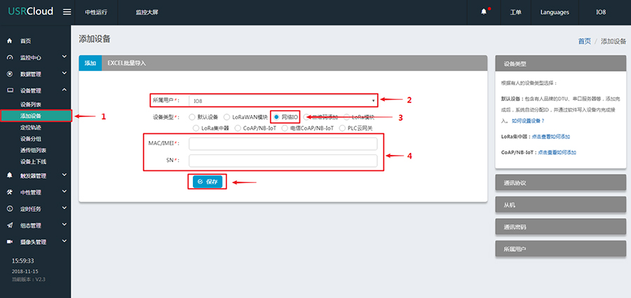 点击“添加设备”,录入设备信息
