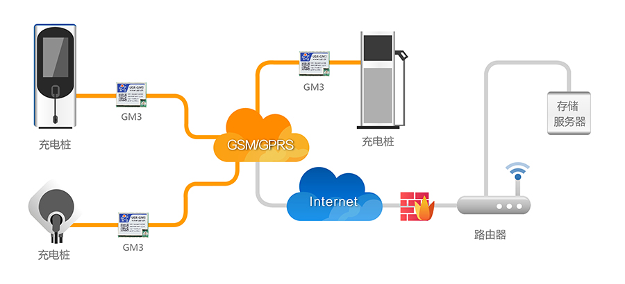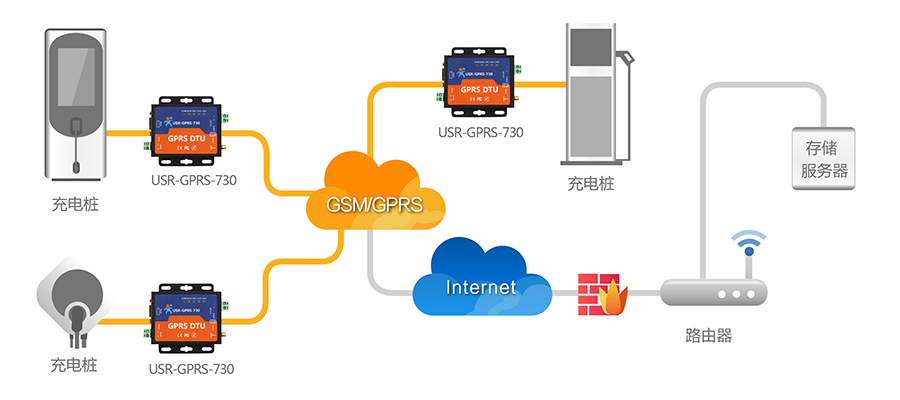 充电桩系统由充电桩、有人DTU、后端网管平台、数据管理中心以及基于互联网的各种APP应用构成。充电桩拥有RS232或者RS485接口,通过串口直接连接USR-GPRS-730,通过DTU的数据透传功能,将充电桩的数据,通过GPRS网络上传到服务器,实现充电桩数据联网。充电桩运营企业可以远程实时监控以及维护。