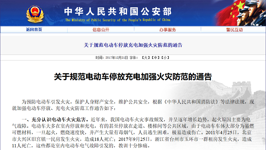 此后,全国多个地方政府纷纷出台相关政策。济南市公安局下发了《关于进一步加强电动车消防安全管理的通知》;北京市住房和城乡建设委员会转发了《规范电动车安全使用管理工作方案》;江苏省消防安全委员会下发了《电动车停放、充电场所和民用建筑燃气使用场所消防安全须知》。