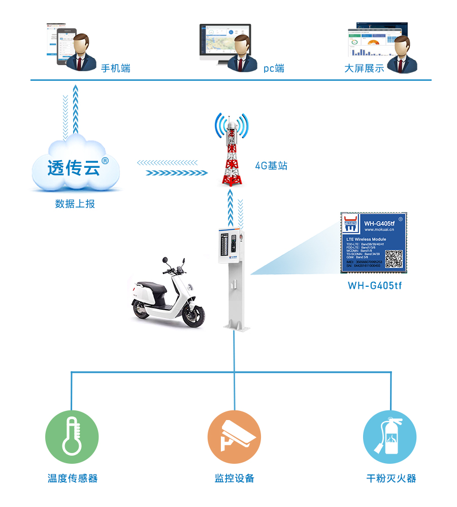 2、智能充电桩内嵌4G模块,用于联网传输,充电、支付、工作等数据可通过云端上报服务器,便于厂商、运营商实时了解终端设备工作详情