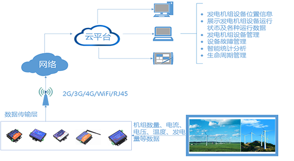 有人发电机组物联网远程监控系统对网络内的风力发电机组实时的监测和控制,实现了对风力发电机组的远程在线监测、跟踪、状态确认和控制及高效节能运行。从而提高风力发电机组设备的资源利用率和生产力水平,有效提高机组运行安全性、任务可靠性以及降低系统全寿命周期费用,有利于预防机组恶性事故发生、避免人身伤亡及巨大经济损失。