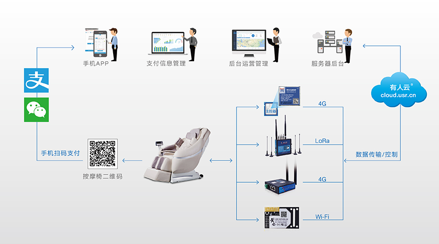顾客通过移动支付功能进行二维码扫码支付,手机将支付信息上传到云端运营服务器,服务器确认扫码的信息后通过“有人”通讯设备向按摩椅控制器发送启动指令。此外按摩椅控制器会通过“有人”通讯设备与服务器进行状态数据传输。