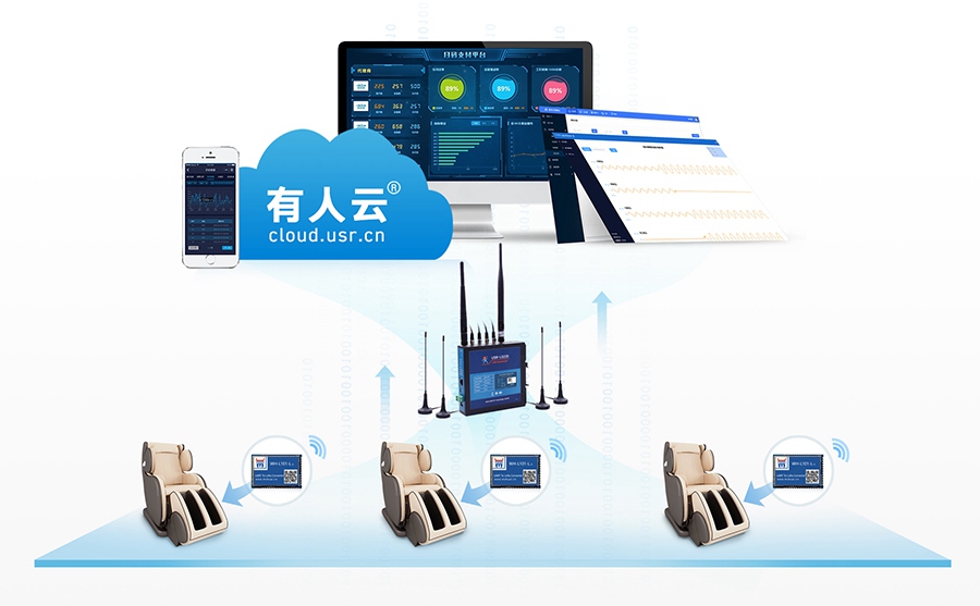 为方便运营商通过平台管理和监控所有按摩椅,为满足不用应用场景,有人物联网提出了基于无线通信技术的共享按摩解决方案,主要实现共享按摩椅的资产定位、机器运行状态数据的实时监控、信息灵活组网传输、远程控制等功能。