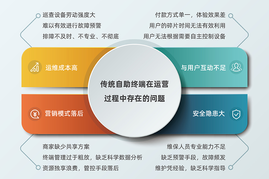 随着共享经济的发展,自助咖啡机、自助榨汁机、自助充电桩、自助洗衣机等共享自助终端已从各个方面融入大众生活,但伴随投放量的增加,传统自助终端在运营过程中也存在如下问题: